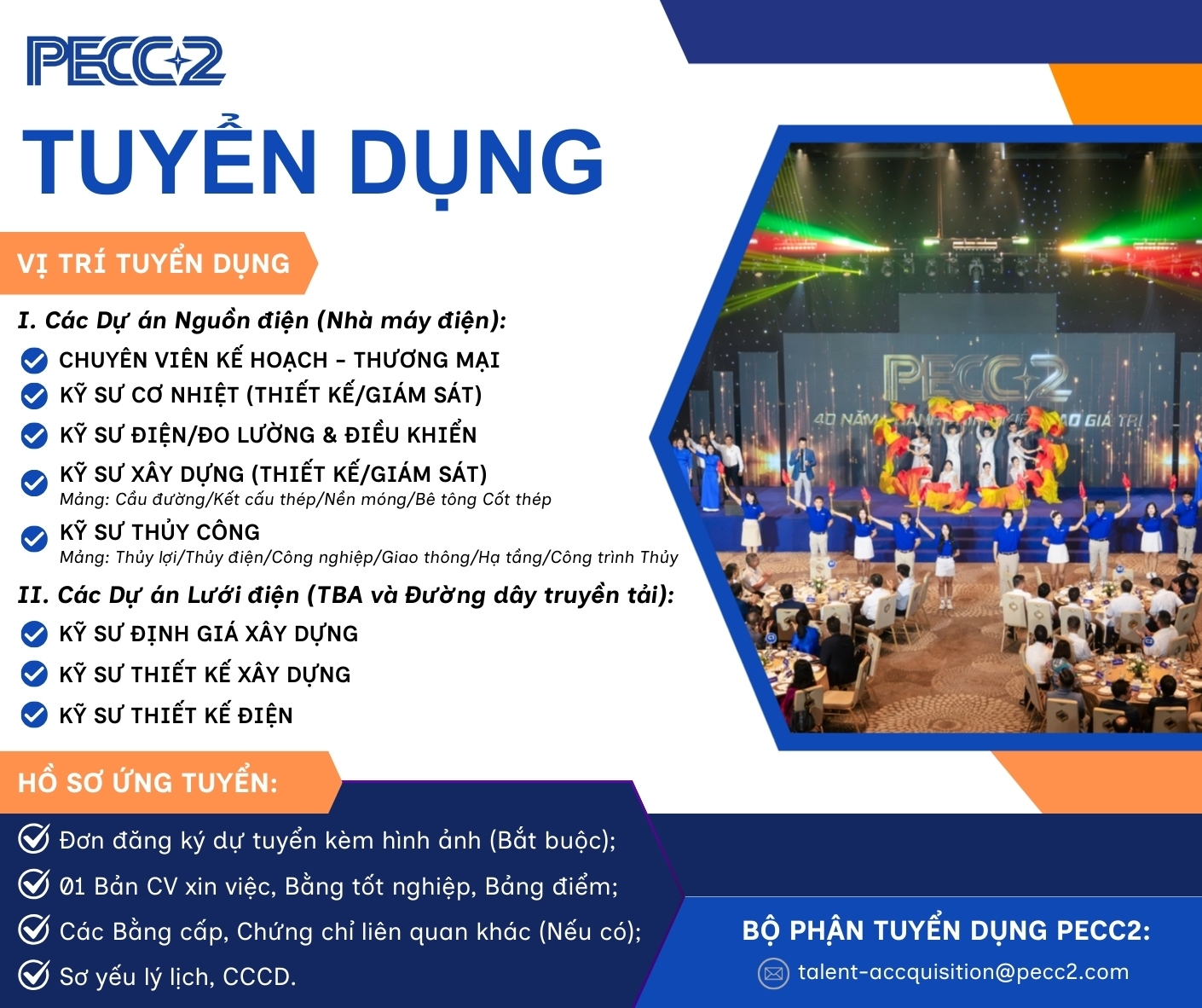 Trước nhu cầu mở rộng quy mô và đón đầu làn sóng Dự án Năng lượng trọng điểm Quốc gia, Công ty Cổ phần Tư vấn Xây dựng Điện 2 (PECC2) thông báo tuyển dụng nhiều vị trí trong lĩnh vực Nguồn điện và Lưới điện - Tìm kiếm Đội ngũ đam mê kỹ thuật, sẵn sàng bứt phá, tham gia trực tiếp vào các Công trình tiêu chuẩn Quốc tế với các cơ hội phát triển nghề nghiệp bền vững và dài hạn.