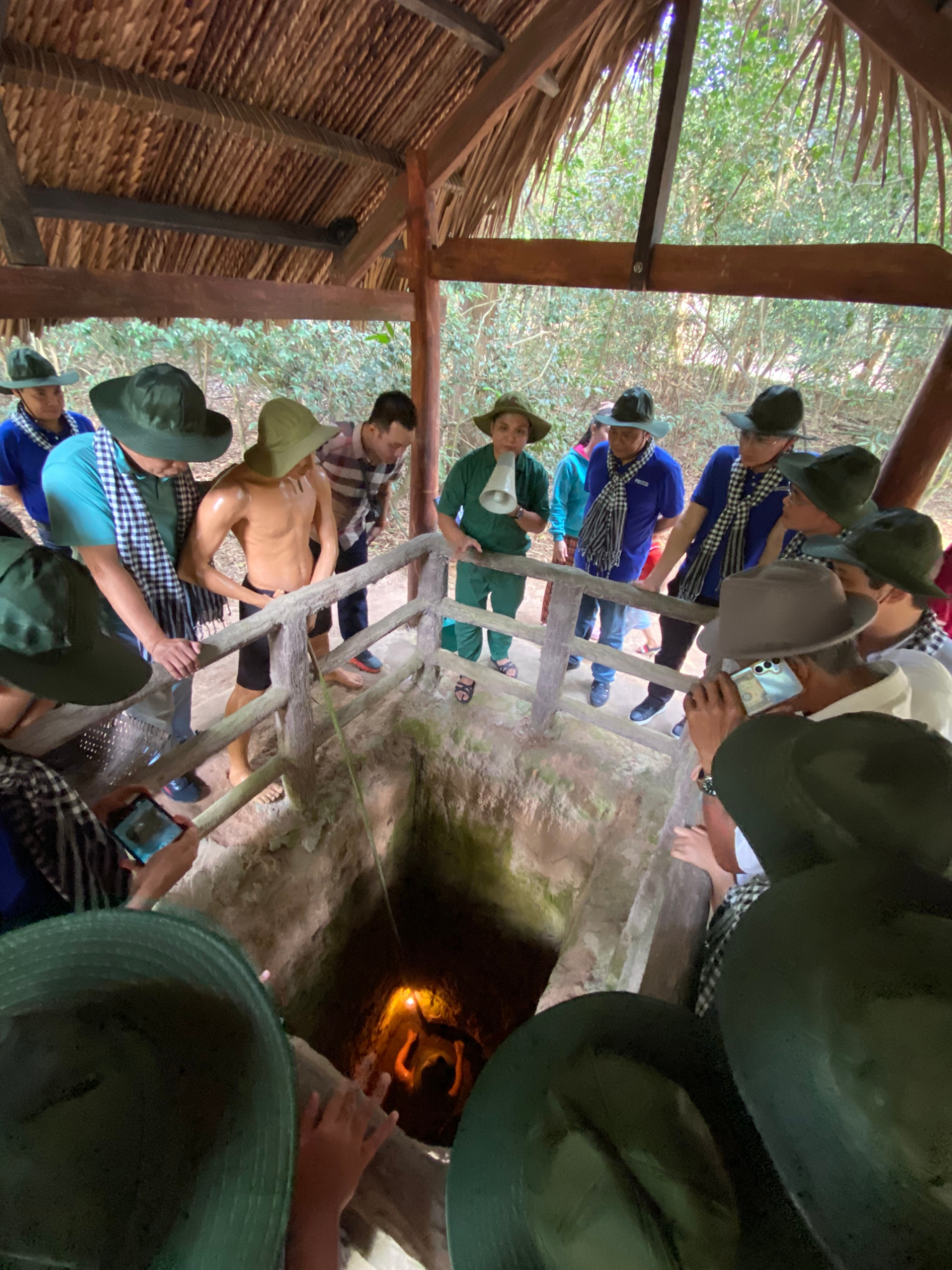 Tiếp nối chương trình, đoàn di chuyển đến Khu di tích lịch sử Địa đạo Củ Chi. Tại đây, các đảng viên và người thân đã được nghe thuyết minh, xem phim tư liệu và trực tiếp tham quan hệ thống địa đạo – biểu tượng cho trí tuệ, bản lĩnh và ý chí kiên cường của quân và dân Củ Chi trong những năm tháng kháng chiến ác liệt. Không gian chật hẹp, tối tăm của địa đạo càng làm nổi bật hình ảnh “ánh sáng trong bóng tối” – nơi tinh thần yêu nước, niềm tin và khát vọng độc lập vẫn rực sáng giữa muôn vàn gian khó.