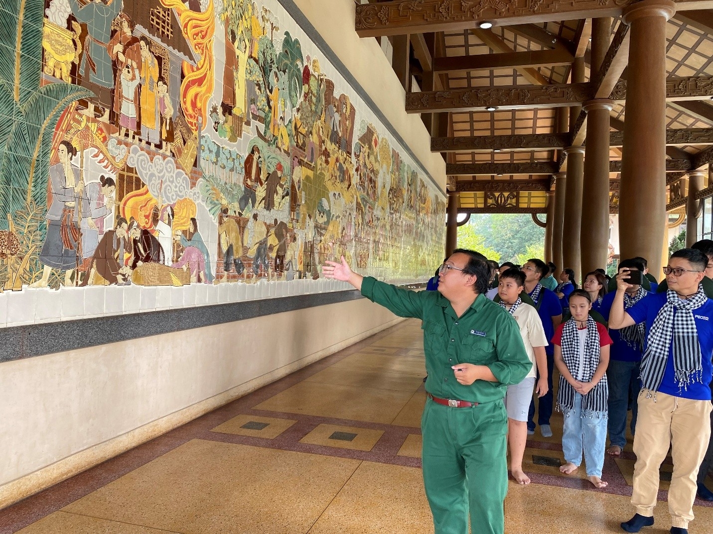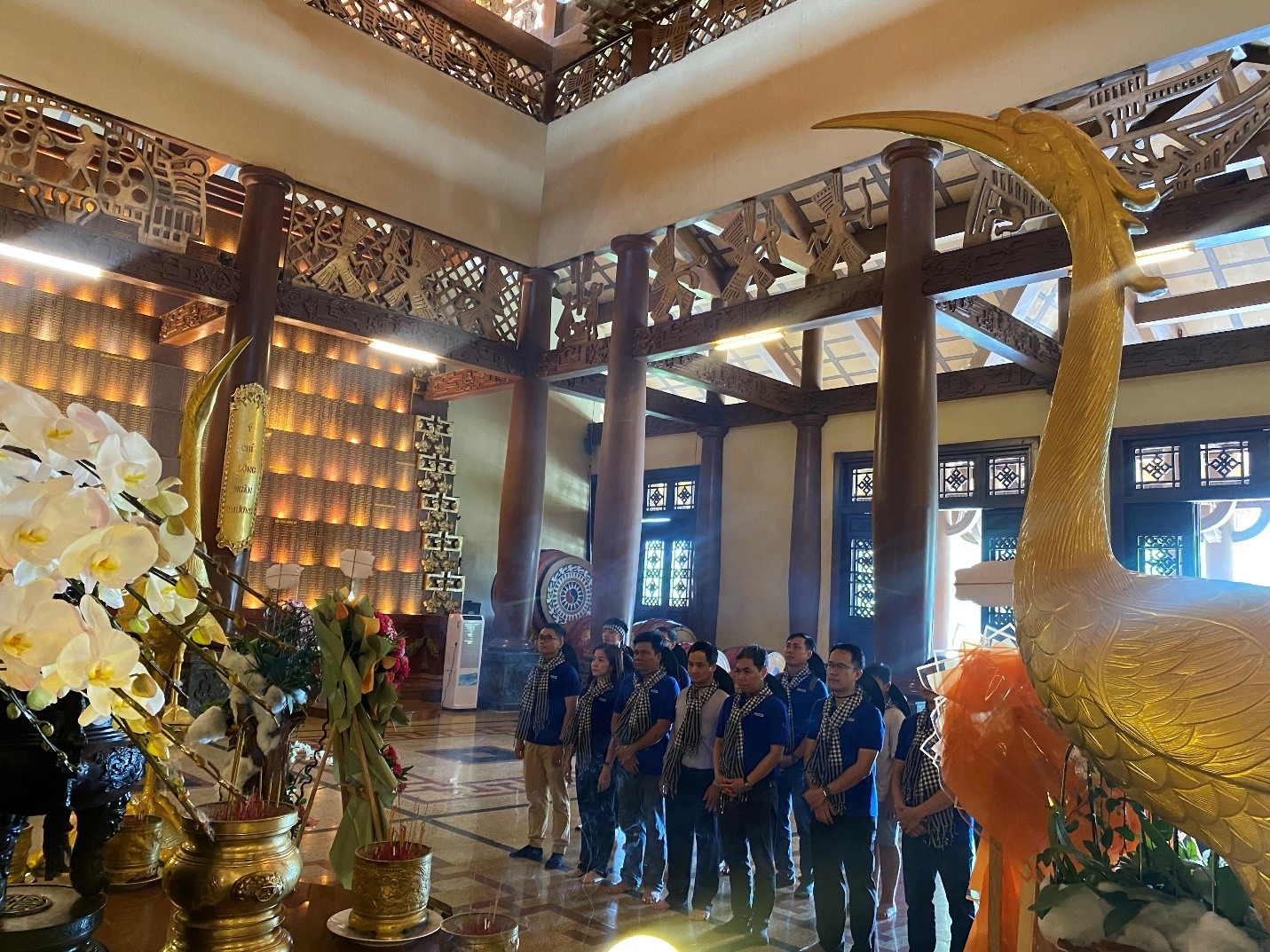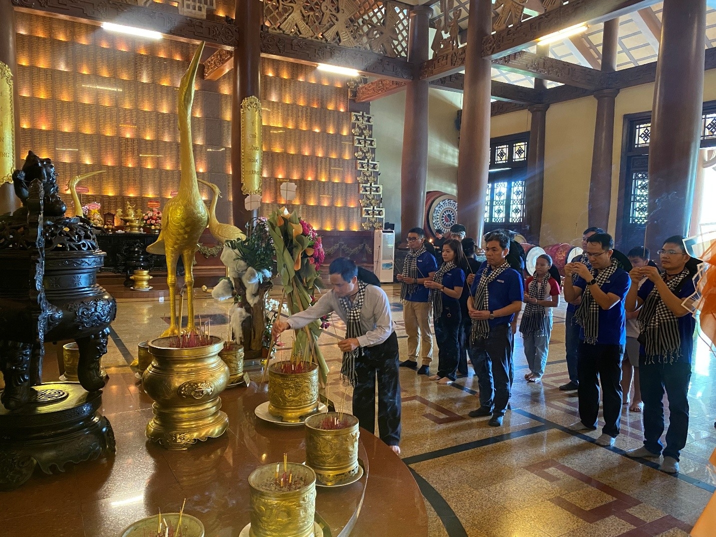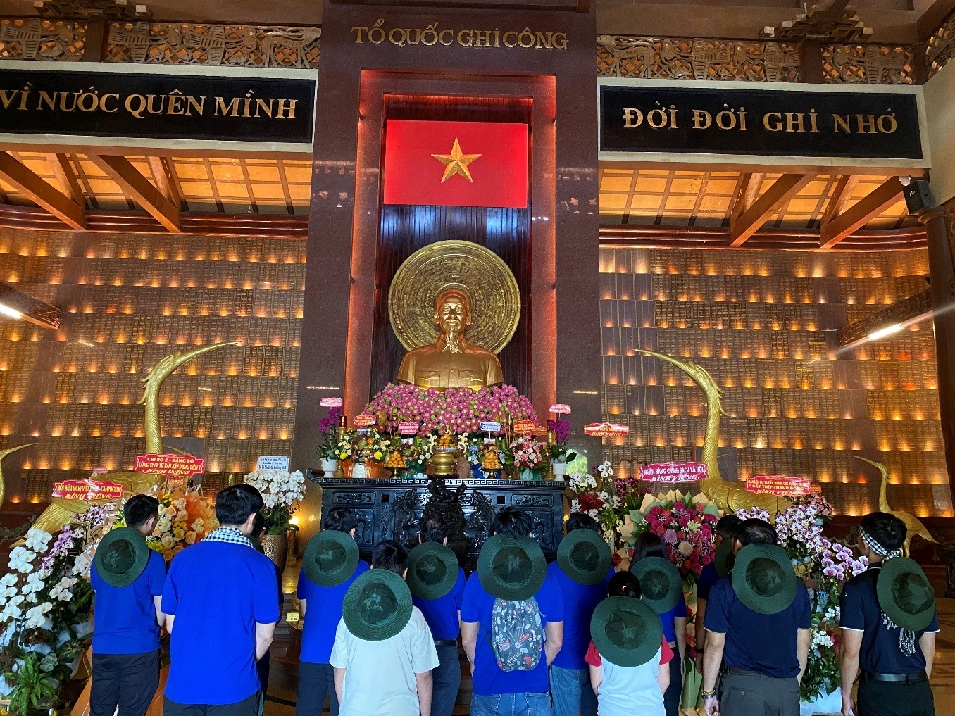 Điểm dừng chân đầu tiên của đoàn là Đền tưởng niệm liệt sĩ Bến Dược – nơi ghi danh hơn 44.000 anh hùng liệt sĩ đã hy sinh vì độc lập, tự do của Tổ quốc. Trong không khí trang nghiêm, đoàn đã thành kính dâng hương, dâng hoa, dành phút mặc niệm để tưởng nhớ và tri ân công lao to lớn của các thế hệ cha anh. Đây không chỉ là nghi thức truyền thống mà còn là khoảnh khắc lắng đọng, giúp mỗi đảng viên thêm thấm thía giá trị của hòa bình, độc lập và trách nhiệm tiếp nối truyền thống cách mạng.