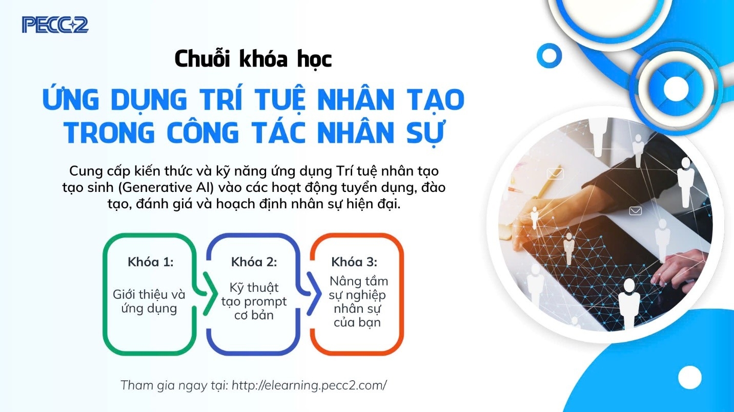 Công ty giới thiệu chuỗi khóa học “Generative AI for Human Resources (HR) Professionals” do Coursera triển khai hiện đã được cập nhật trên hệ thống PECC2 Elearning, bao gồm 03 khóa học ngắn hạn, mỗi khóa có thời lượng từ 6–11 giờ, người học có thể tự học theo tiến độ cá nhân.