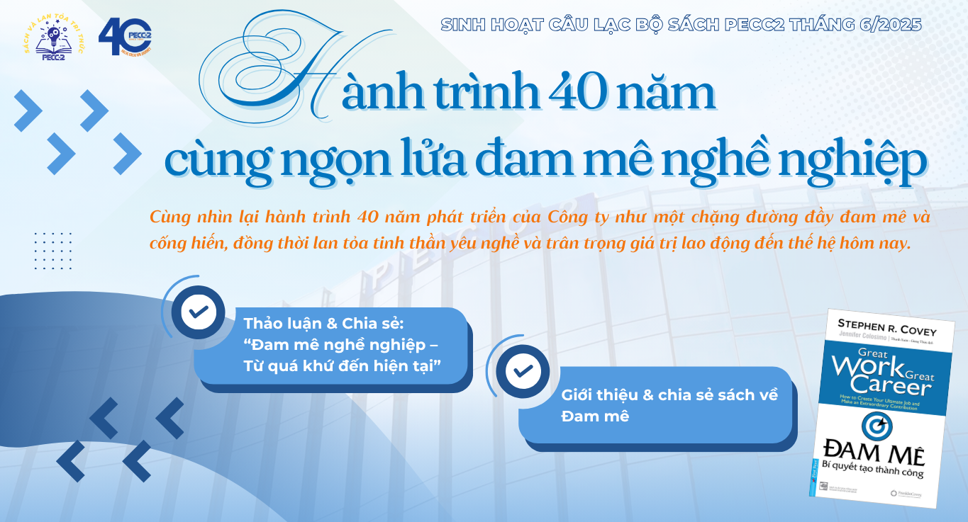 Trong khuôn khổ các hoạt động chào mừng 40 năm thành lập Công ty Cổ phần Tư vấn Xây dựng Điện 2 (PECC2) (01/7/1985 – 01/7/2025), Câu lạc bộ Sách và Lan tỏa tri thức PECC2 đã tổ chức buổi sinh hoạt chuyên đề với chủ đề “Hành trình 40 năm – Cùng ngọn lửa đam mê nghề nghiệp”, mang đến thông điệp sâu sắc: đam mê nghề nghiệp không phải là điều xa vời, mà chính là chìa khóa dẫn đến thành công đích thực.